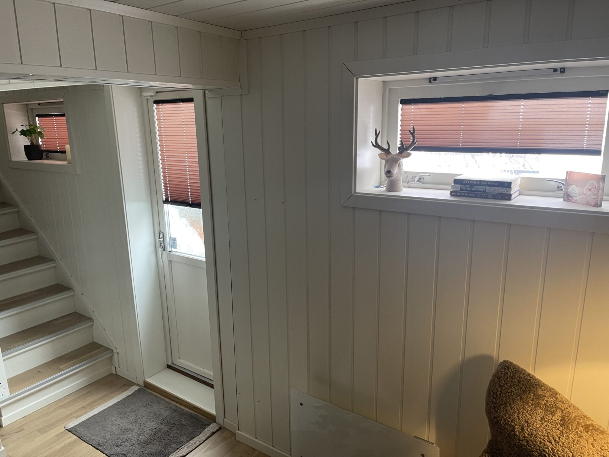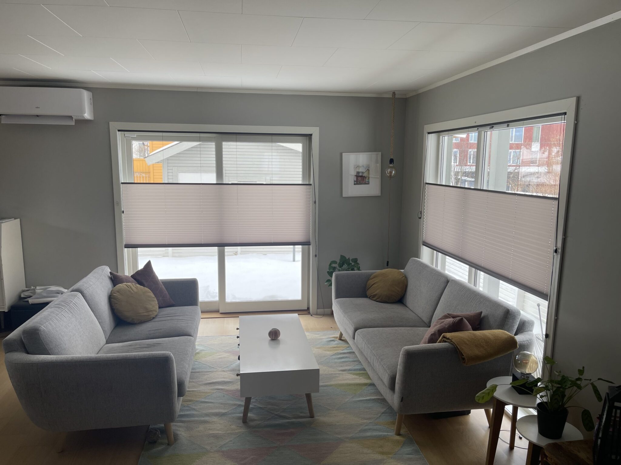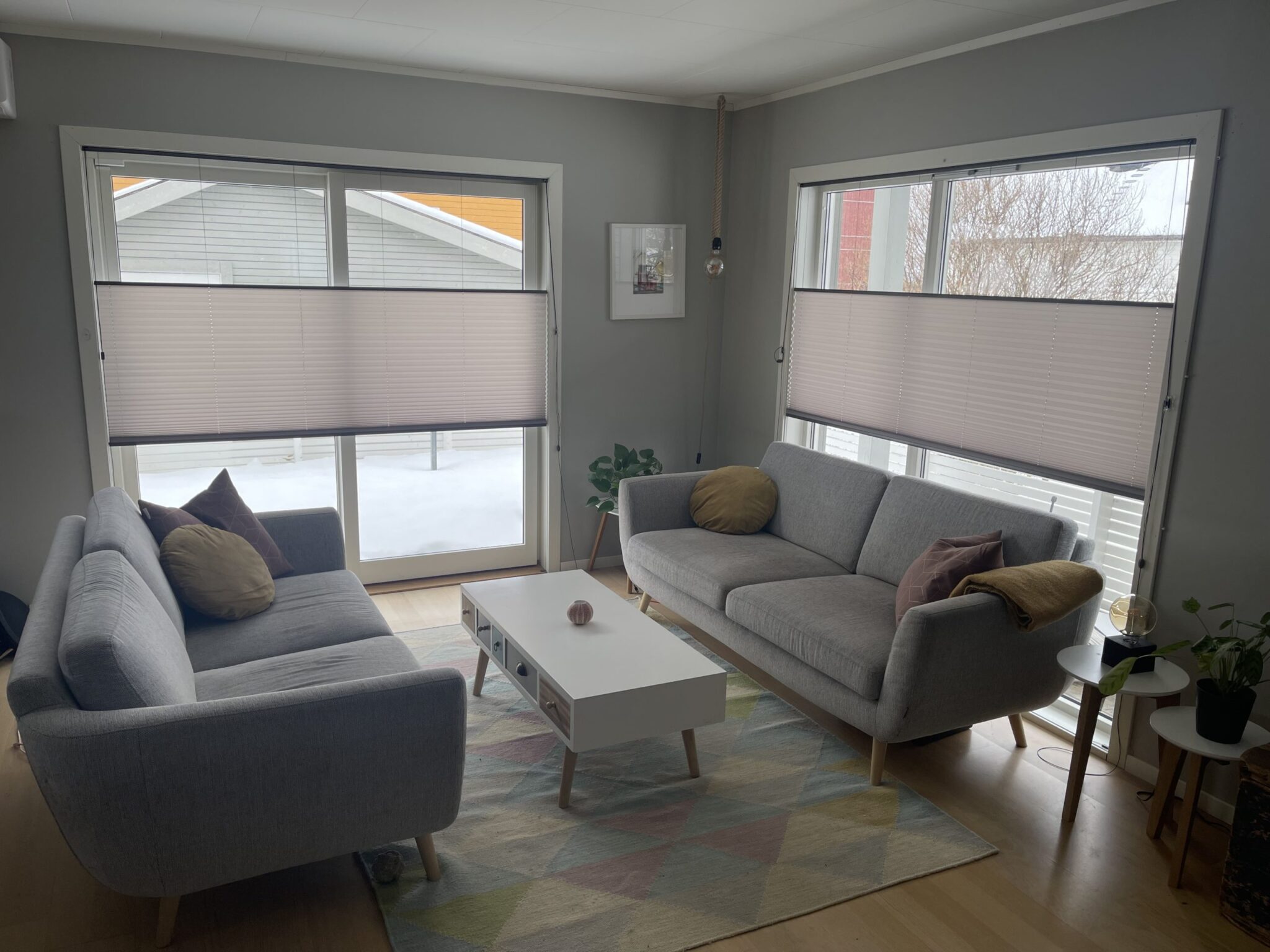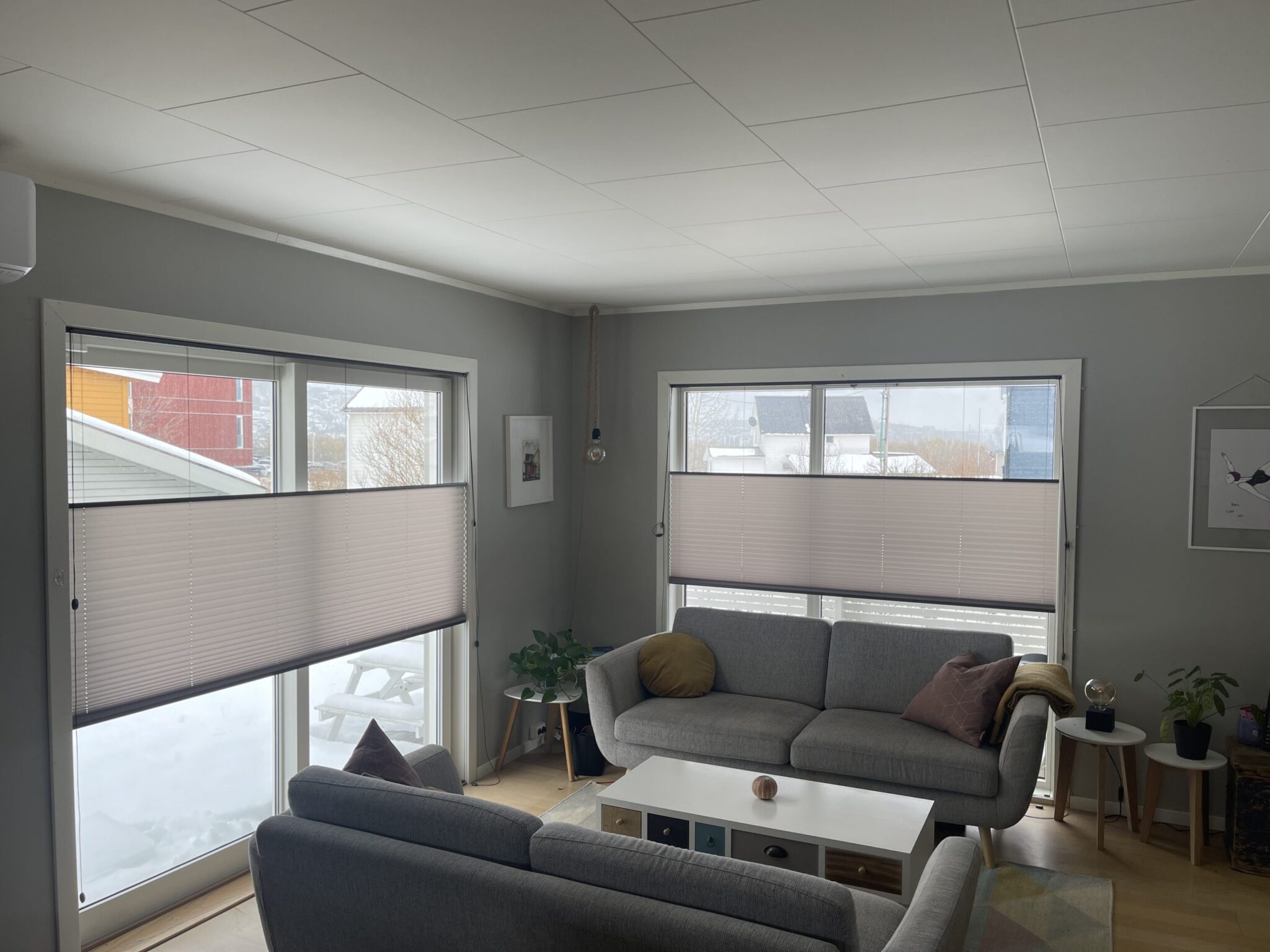 Vi har levert plisségardiner med snorbetjening og grepbetjening i topp og bunn – enkel duk til stue og tv-stue. Kunden skriver «Vi er kjempefornøyd med ny look i stue og tv-stue. God kvalitet, super service, enkelt å montere selv og gardinene ser fantastiske ut, både i mørketid og nå som det lysner ute. Anbefales!»