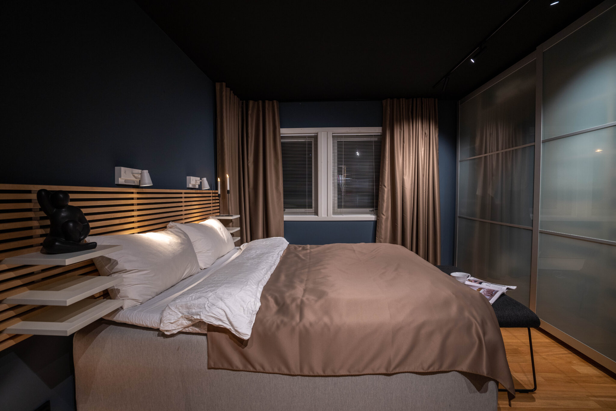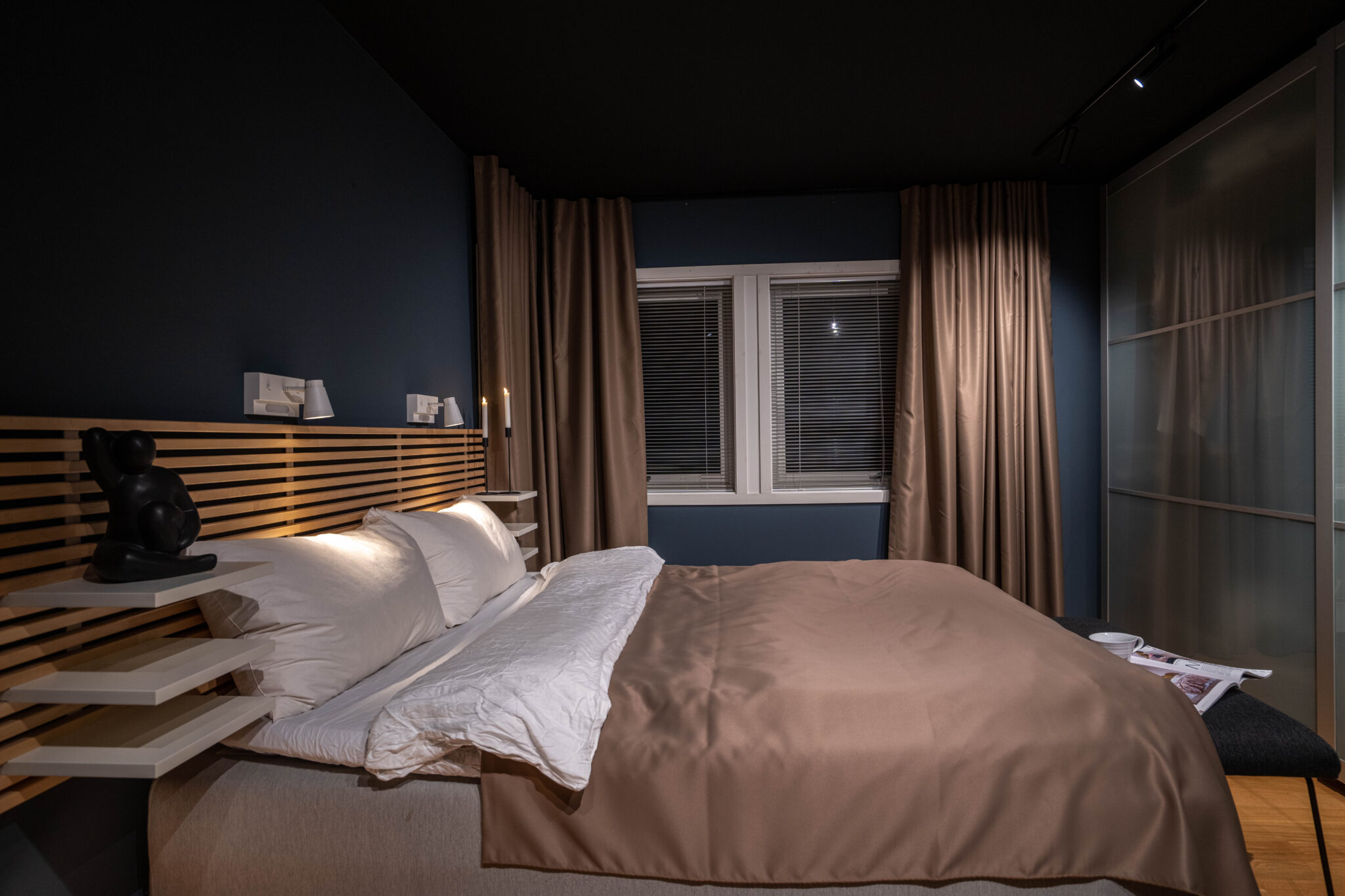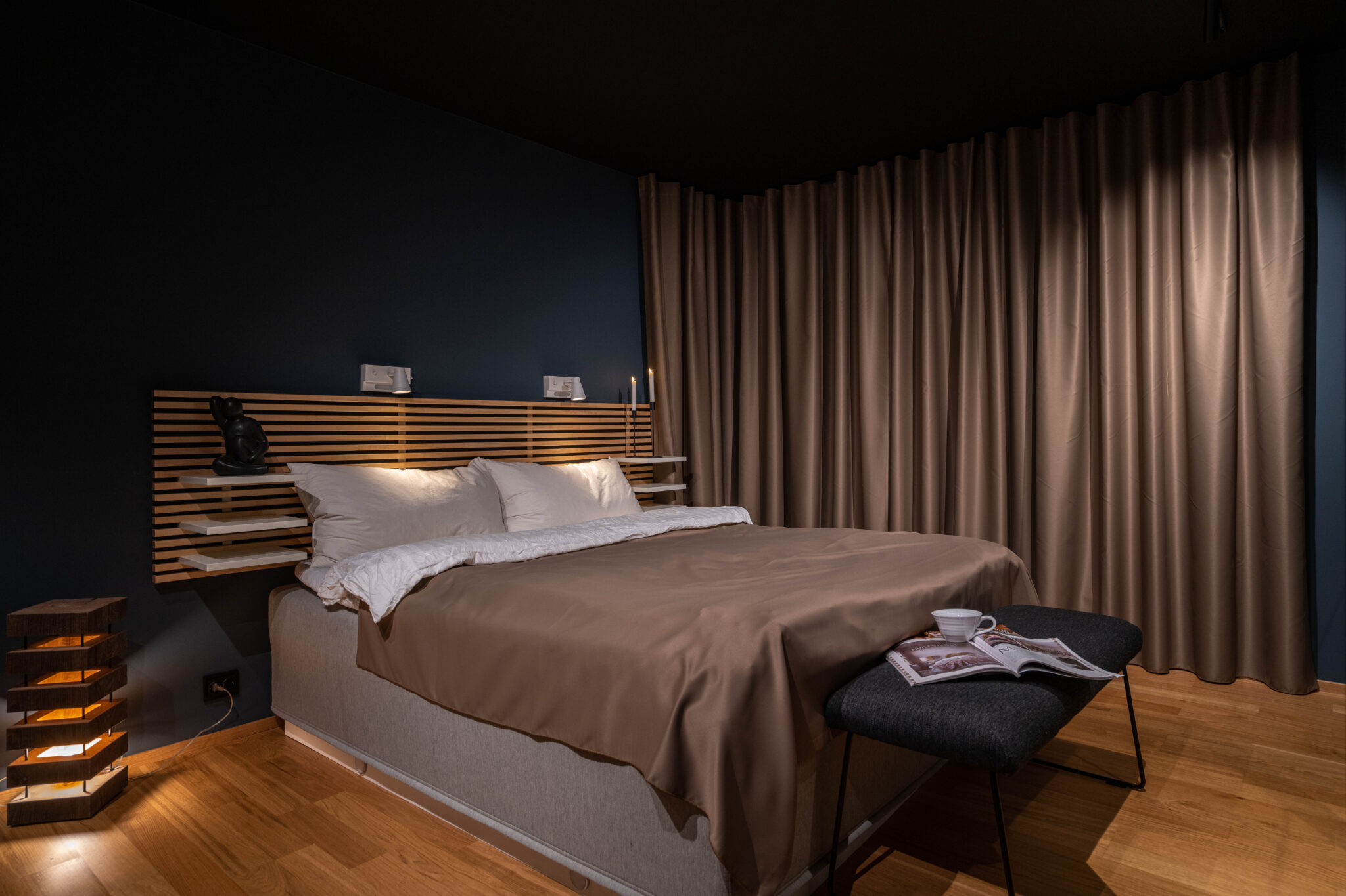 «Bare det å endre farge på gardiner kan endre uttrykket totalt. Digger litt tunge gardiner som når fra tak og helt ned til gulv.», skriver Villaskogvegen på Instagram.
