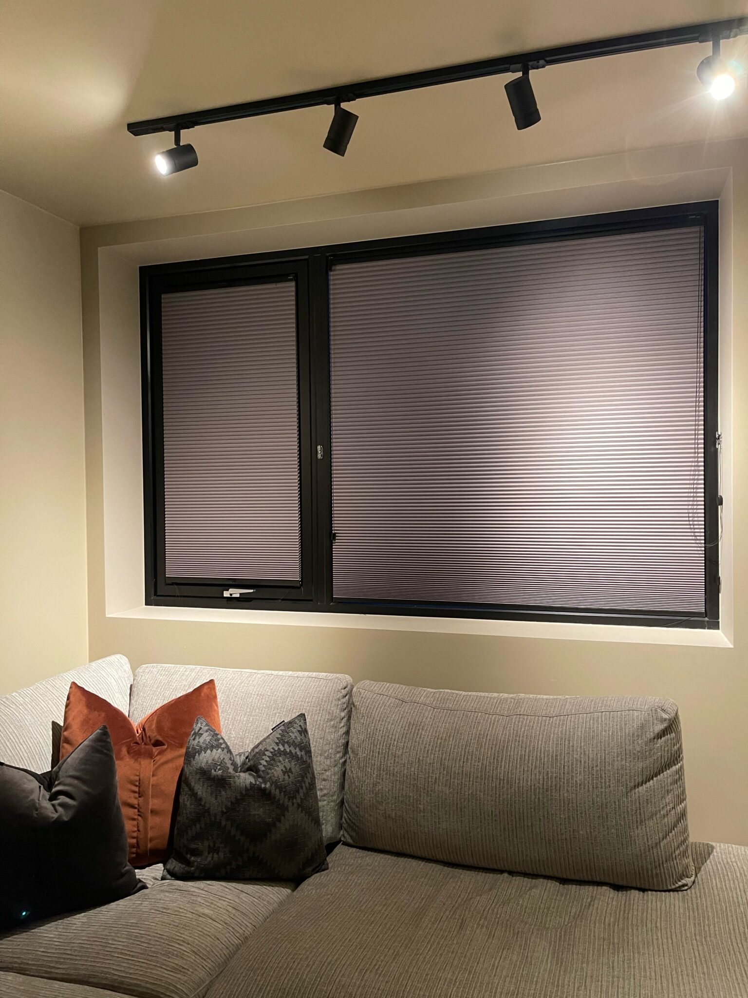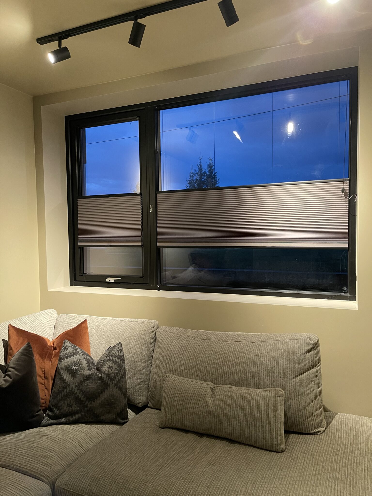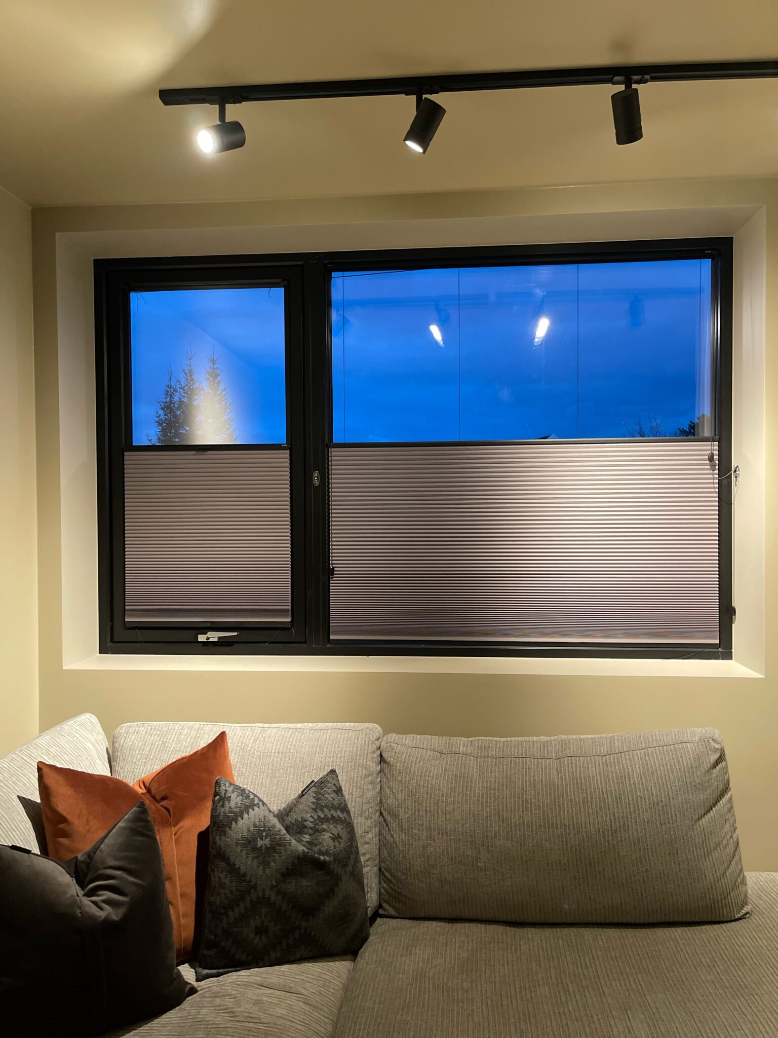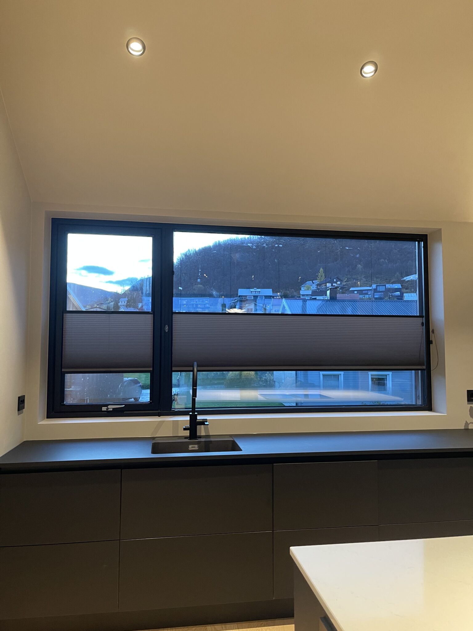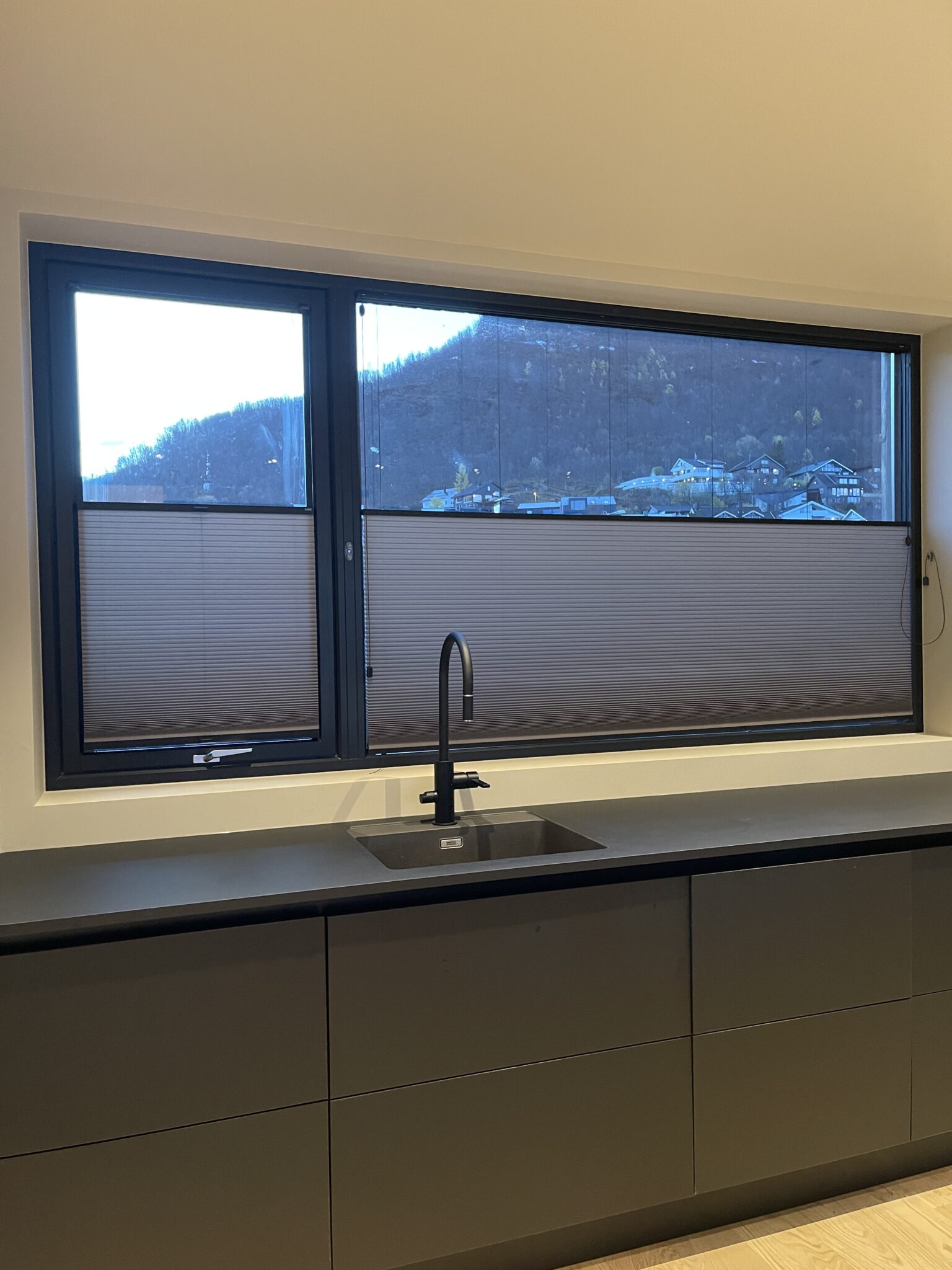 Disse stilrene plissegardinene ble utsmykket med svart skinne for å gå i ett med vindusrammen. Til vinduene som kan åpnes har vi levert plissegardin med list limt på glasset.