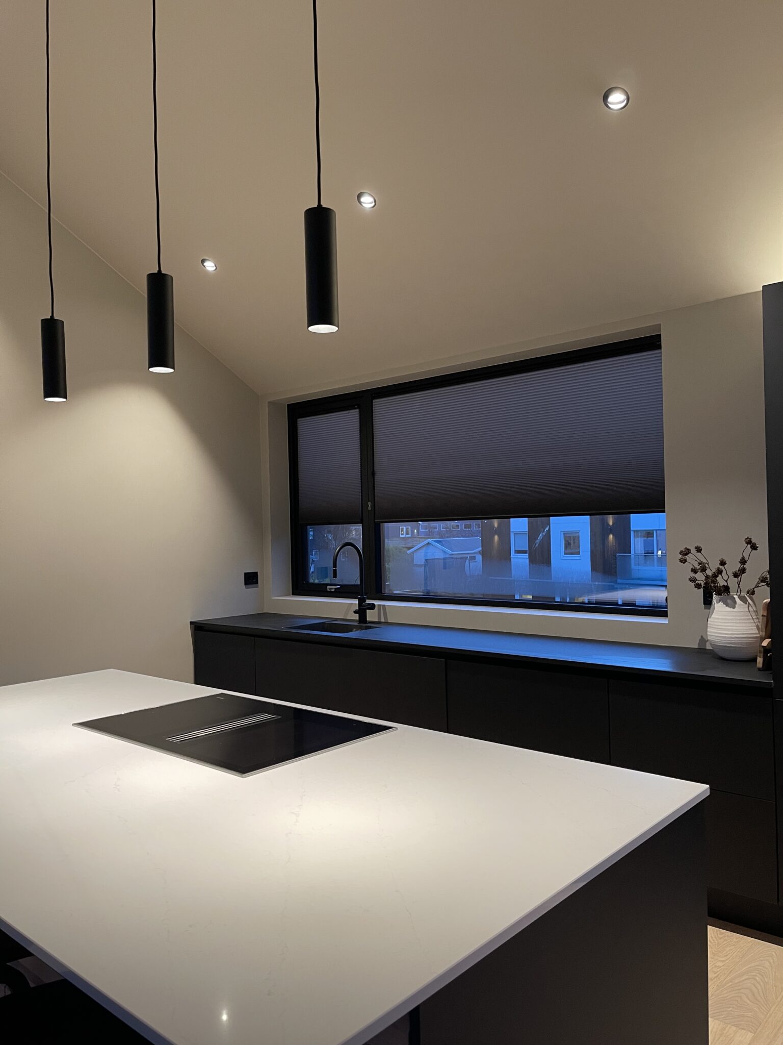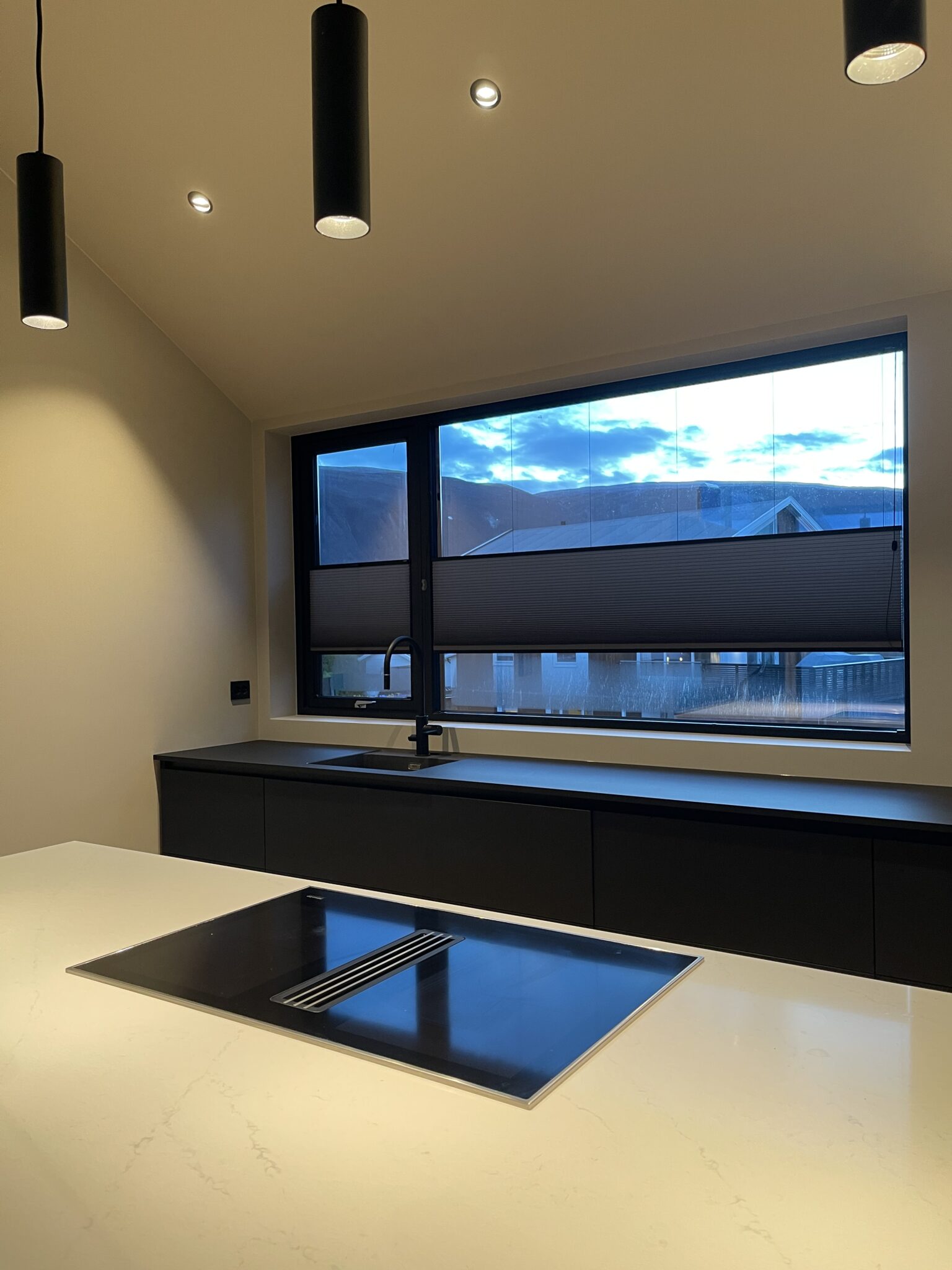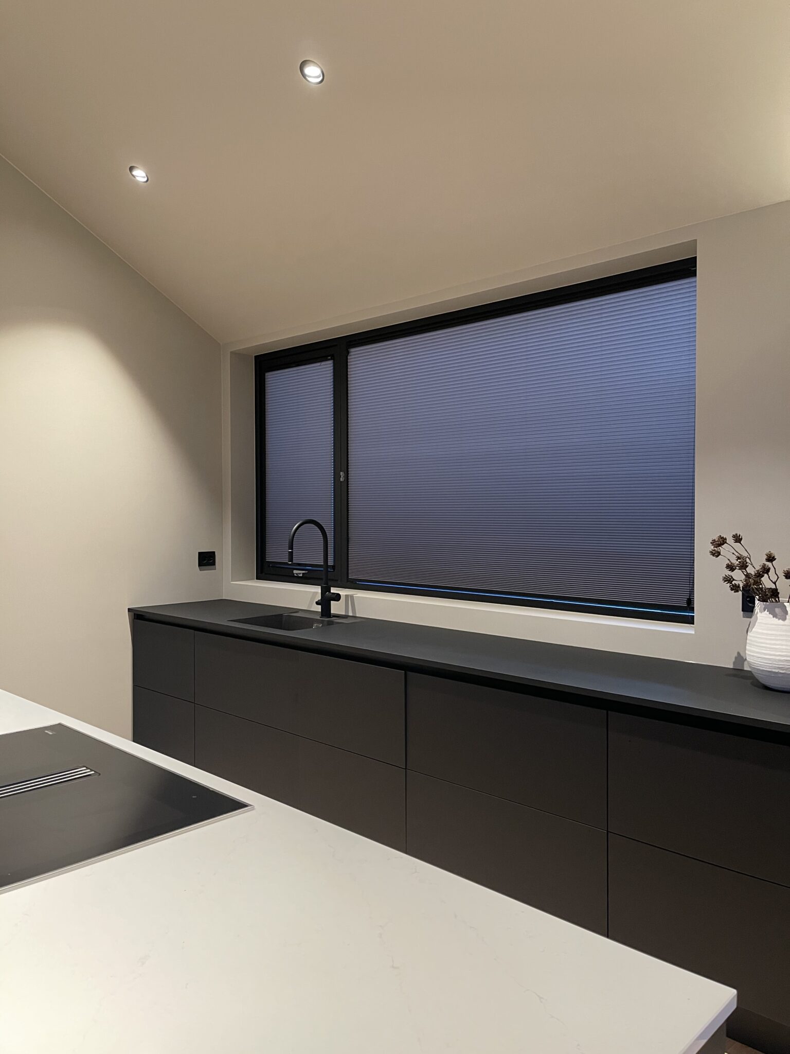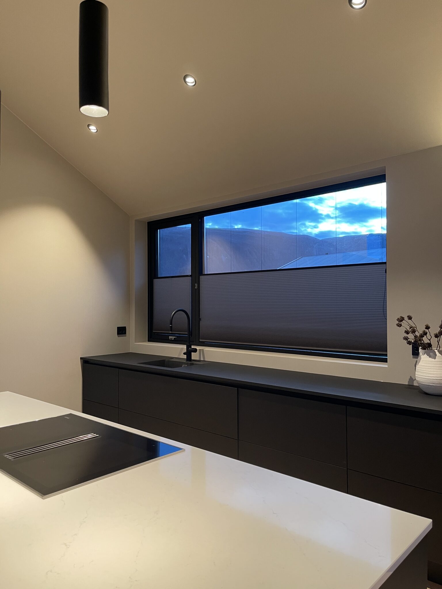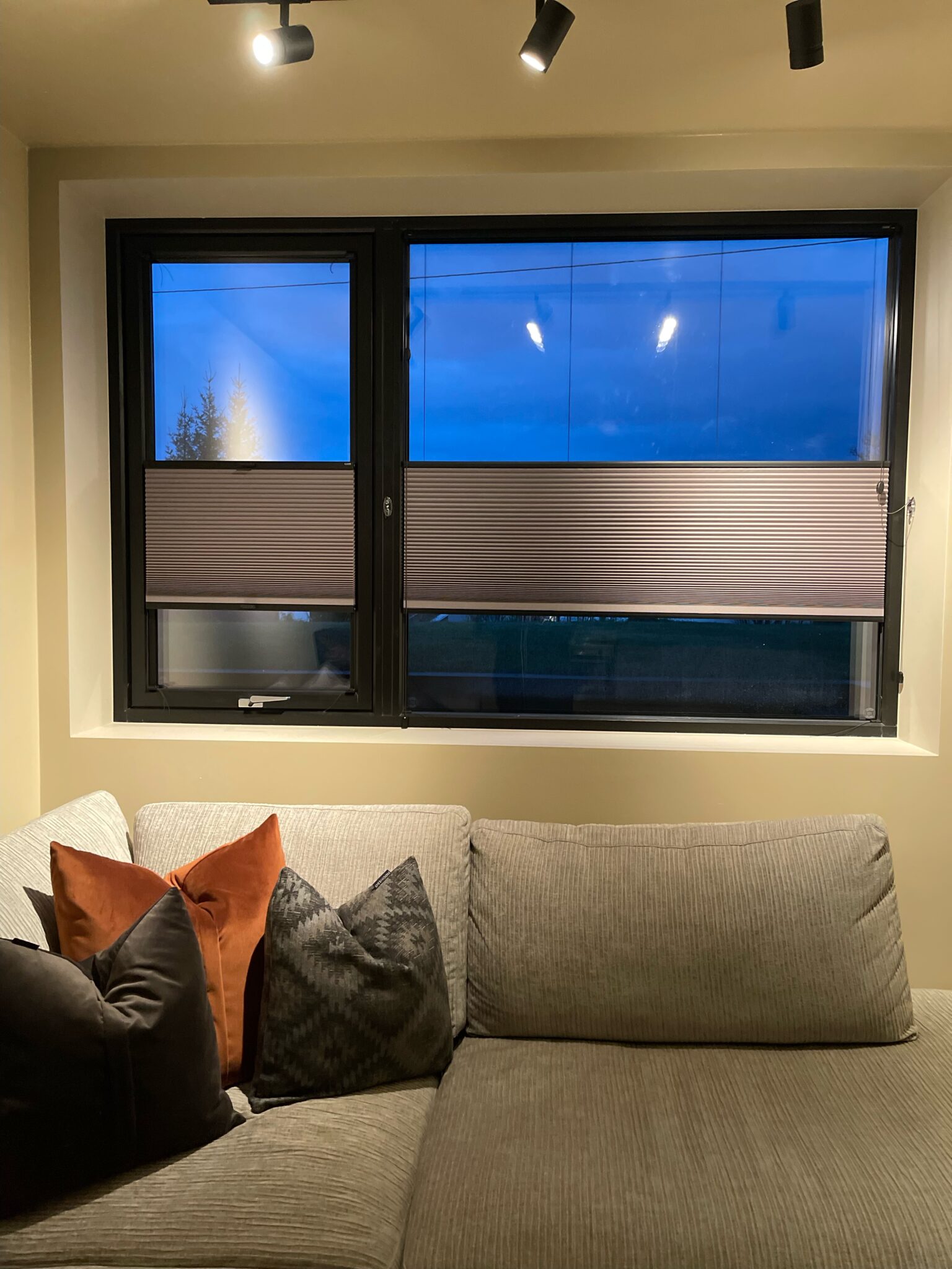 Disse stilrene plissegardinene ble utsmykket med svart skinne for å gå i ett med vindusrammen. Til vinduene som kan åpnes har vi levert plissegardin med list limt på glasset.