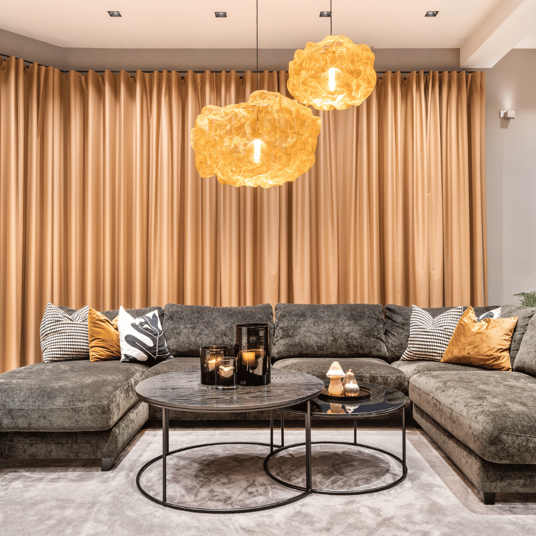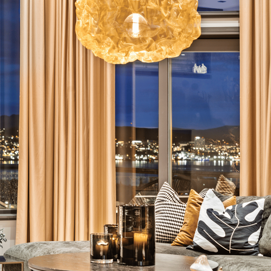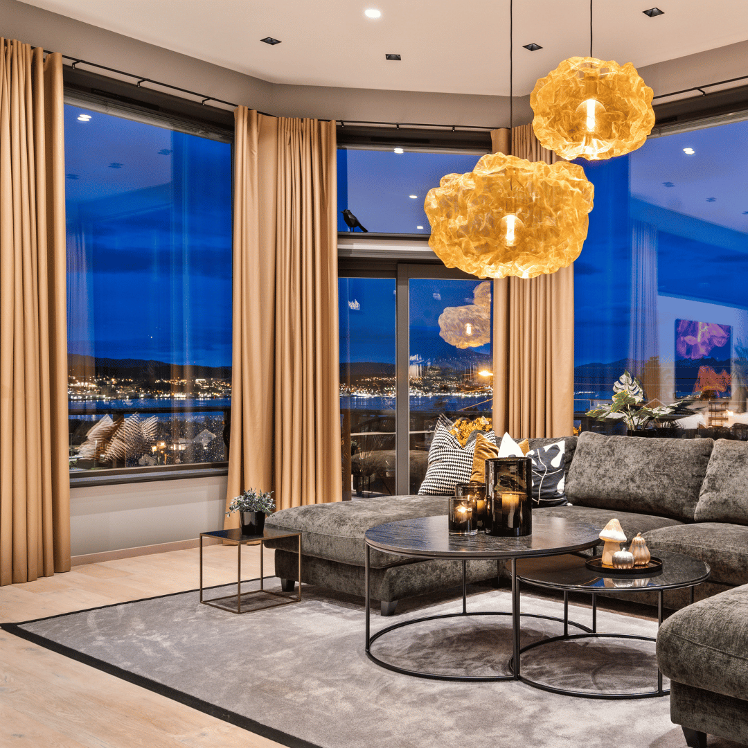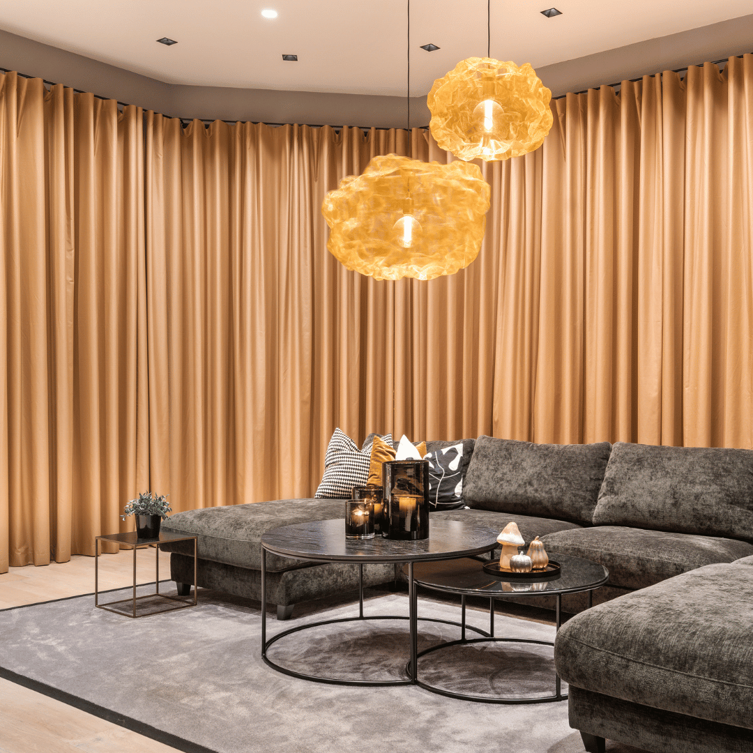 – Herlig stemning inne med fine farger 🧡 Vi må skryte av disse lekre gardinene som er spesialsydd på mål, lystette og ekstra lange for å kunne dekke alle vinduene. Like fine trekt for, som åpne, skriver vår samarbeidspartner Villaskogvegen på Instagram.