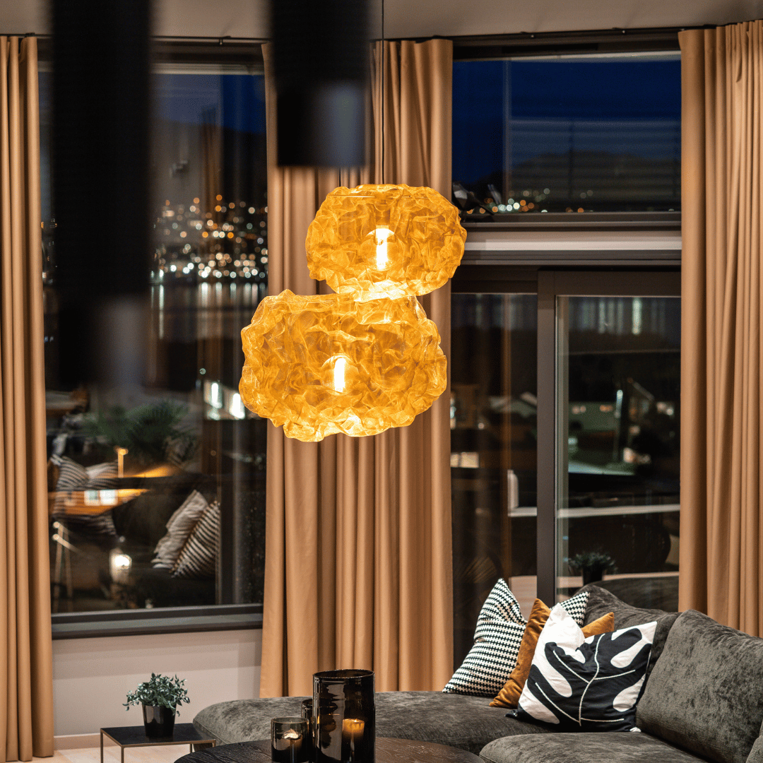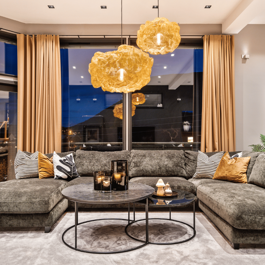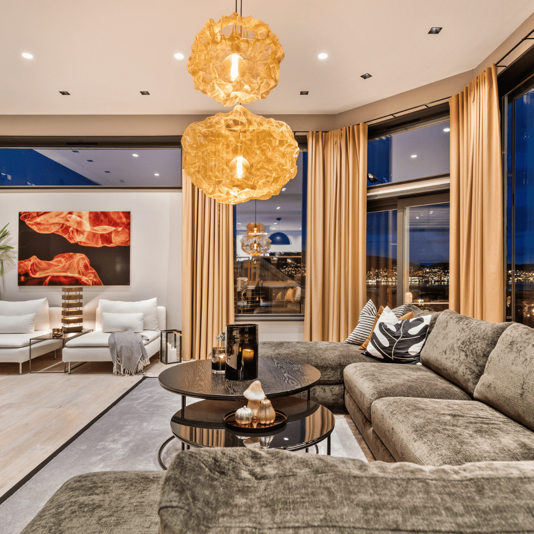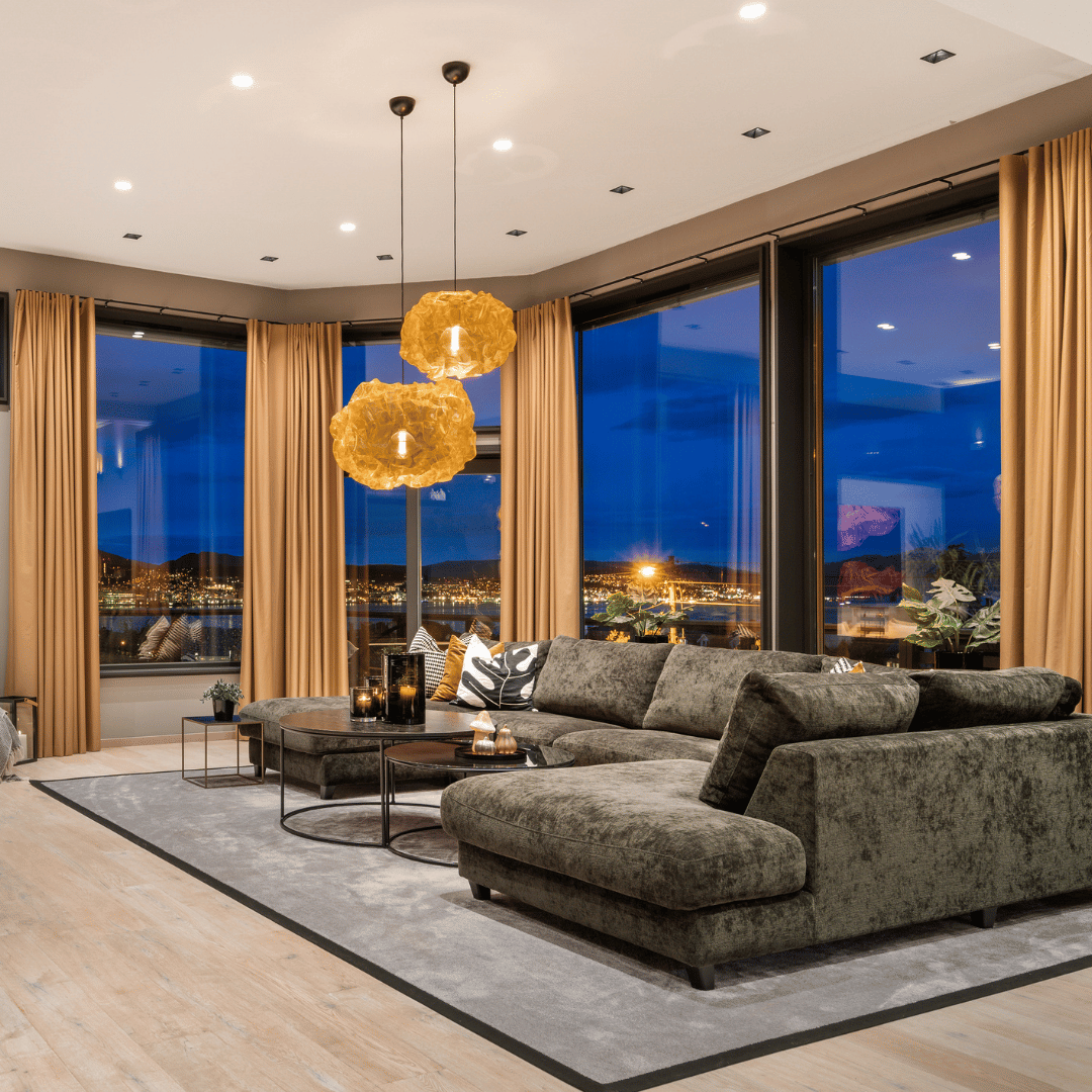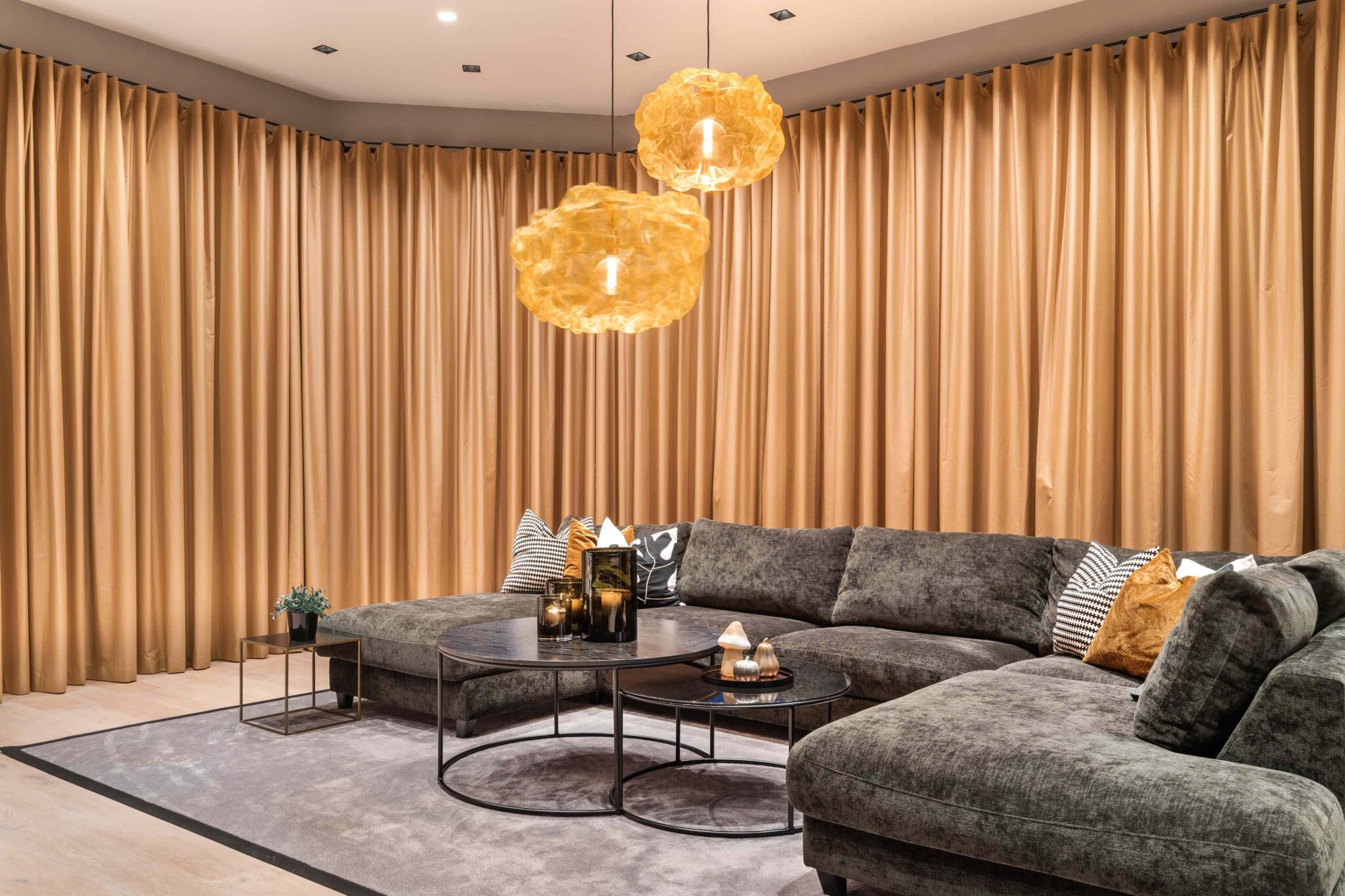 – Herlig stemning inne med fine farger 🧡 Vi må skryte av disse lekre gardinene som er spesialsydd på mål, lystette og ekstra lange for å kunne dekke alle vinduene. Like fine trekt for, som åpne, skriver vår samarbeidspartner Villaskogvegen på Instagram.